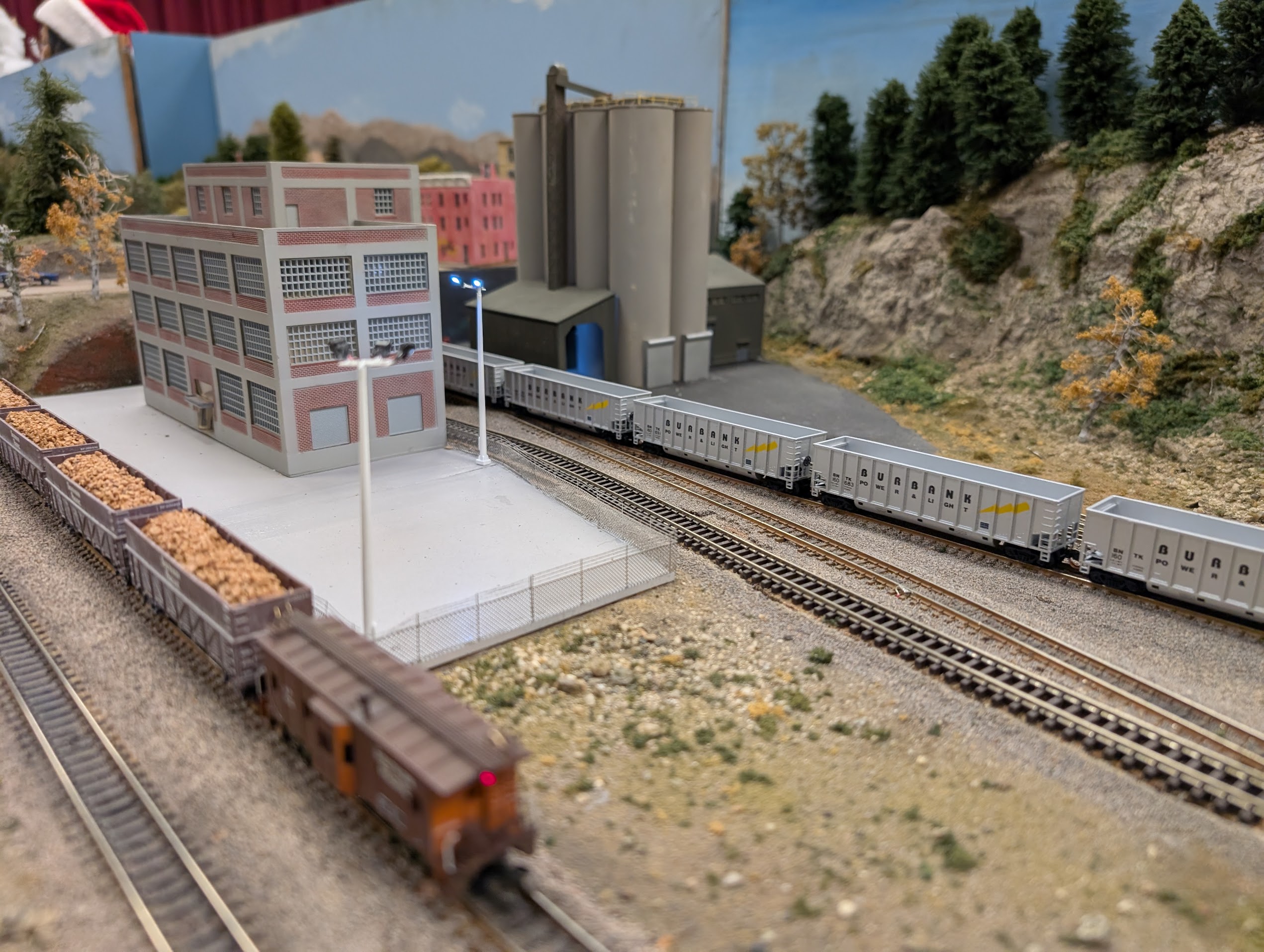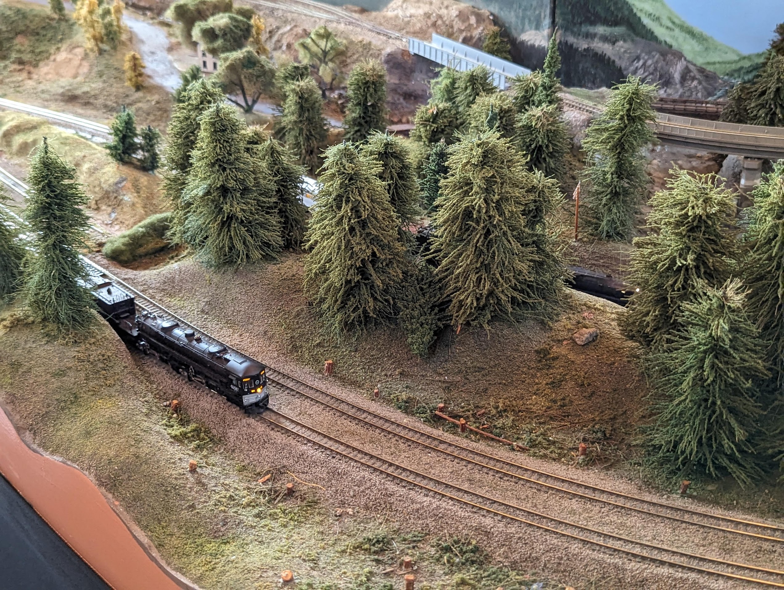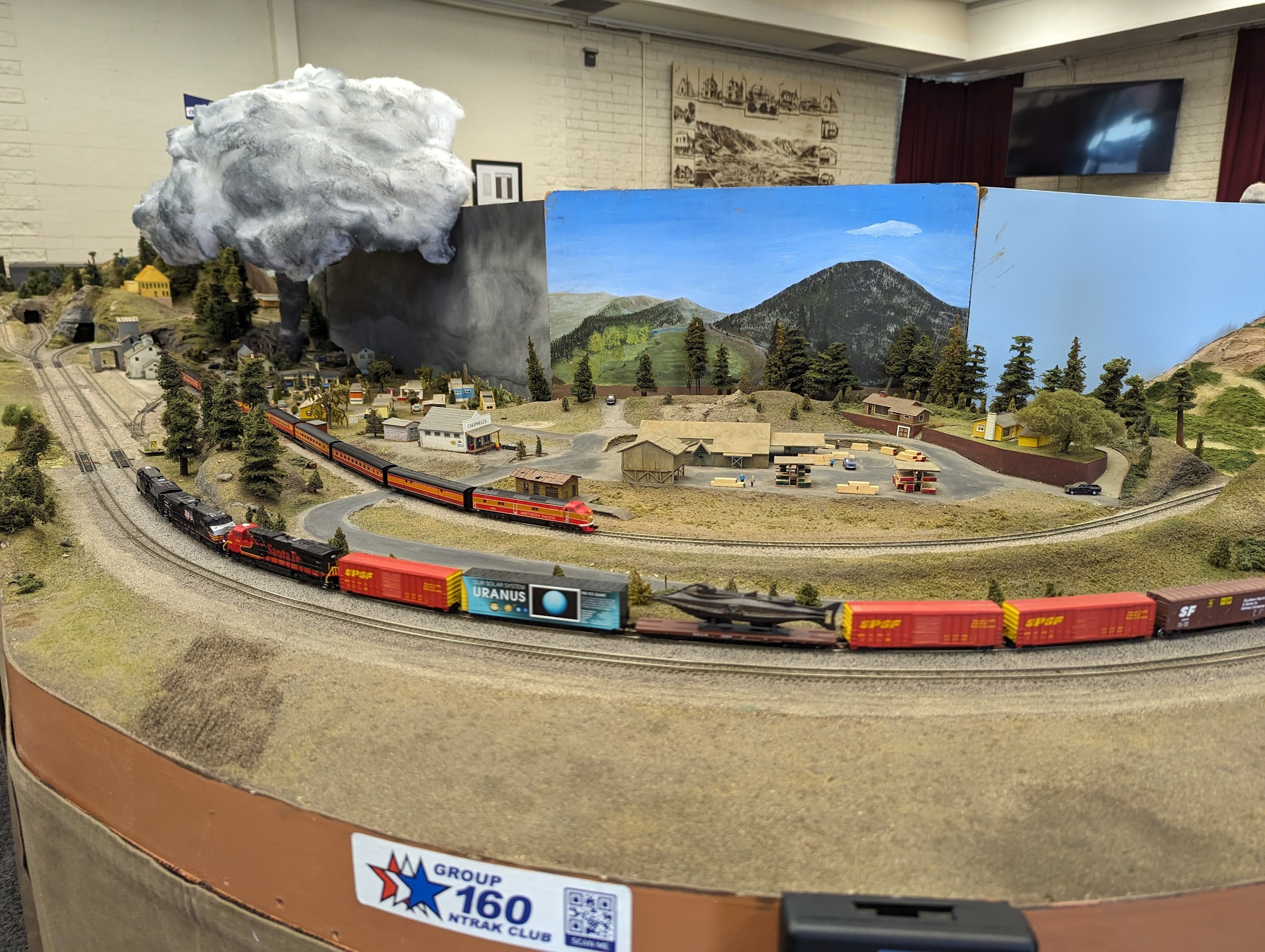 The main theme of Group 160’s club-owned NTRAK modules depicts the Pacific Northwest lumber industry. Club-owned modules include four corner modules, a small town, an animated tornado & fireworks factory, a yard, and an access bridge to the inside of the layout.
